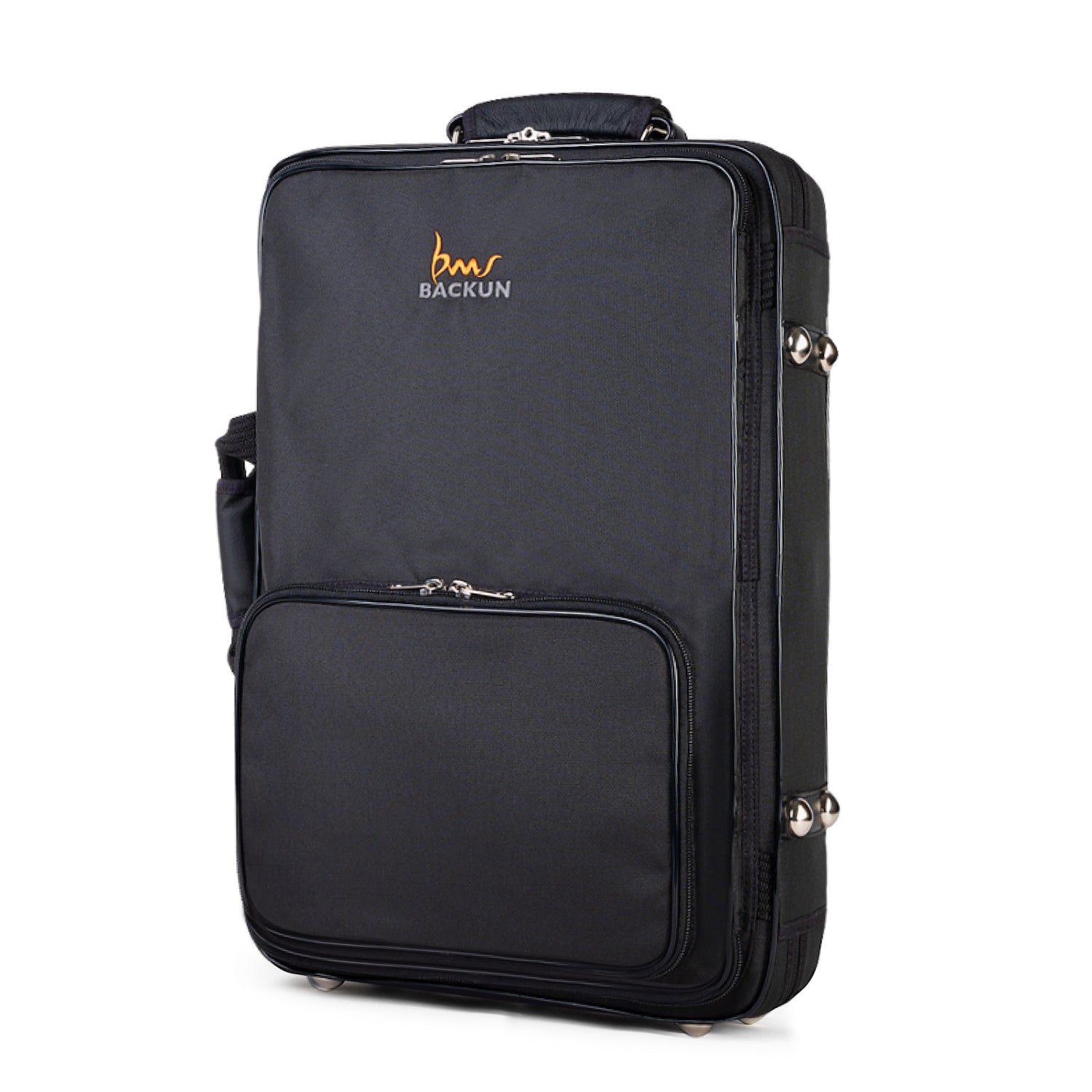 Travel in style and comfort with a Custom Backun Case by Marcus Bonna. This triple clarinet case comfortably fits one Bb Clarinet, one A Clarinet, and one Eb or Basset A Clarinet Lower Joint in a cradle-suspension system designed by Marcus, himself. With enough extra space for plenty of accessories, the modular case design allows the player to adjust the position of the blocking to protect the instruments during day-to-day use and unexpected impacts. Crafted with a fibreglass shell and ballistic nylon cover, the outer case features one large full-size pocket to house a laptop, tablet or music, as well as a smaller pocket for incidentals and accessories, such as charging cables and more. The top handle is well padded and the fully adjustable shoulder straps can be removed, allowing the player to carry the case in briefcase style. It's time you upgraded your clarinet case. It's time you chose a Custom Backun Case by Marcus Bonna.
